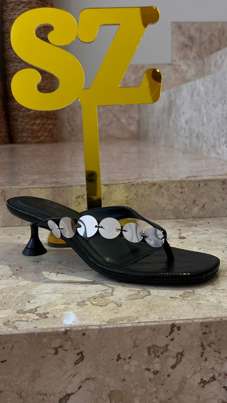 A tira com esferas metalizadas na cor prata traz um toque sofisticado e contemporâneo, enquanto o design valoriza o pé e garante conforto no uso.